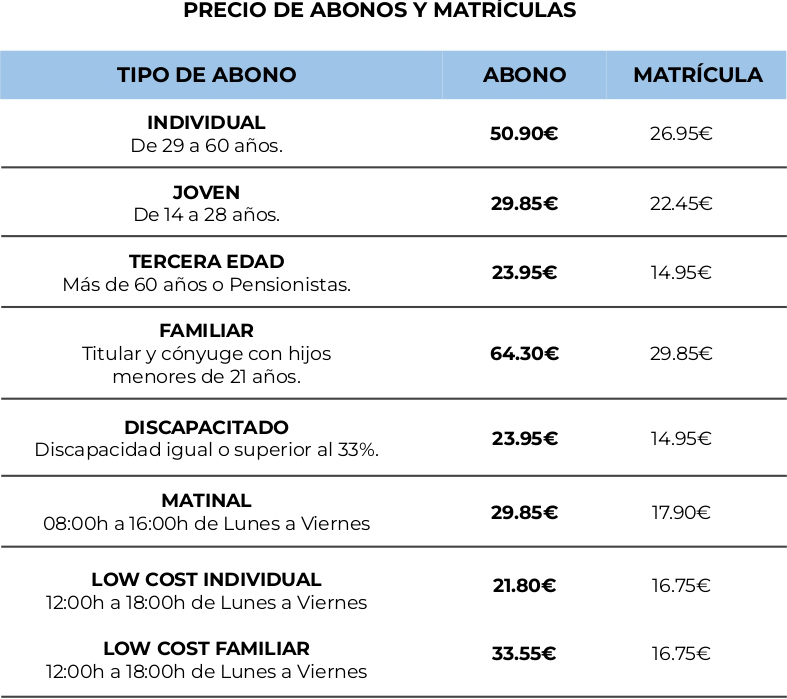 Todos los abonos incluyen acceso a Sala de Musculación, Clases Colectivas y acceso tanto a Piscina en la modalidad de baño libre como a Zona Wellness (Sauna y Spa) del centro.
